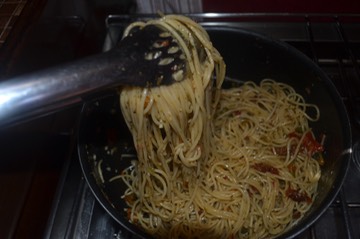 Spaghetti in Salzwasser ca. 6 Min. kochen, abseihen (1 Kaffeetasse vom Salzwasser entnehmen und bereithalten) und kalt abschrecken. Olivenöl erhitzen, gehackten Knoblauch zufügen, leicht anrösten, getrocknete Tomaten klein schneiden, sehr klein gehackten Jalapeño und gehackte Tomate dazugeben und ca. 3-4 Min. anrösten. Kapern dazugeben. Spaghetti zufügen und alles umrühren. Mit Salz, Pfeffer und Kräutern würzen, das Salzwasser dazufügen, damit das ganze nicht anbrennt (man kann stattdessen auch Olivenöl verwenden, aber uns wird das dann zu fett) und einige Minuten ziehen lassen. Parmesan reiben und über die angerichteten Spaghetti streuen!