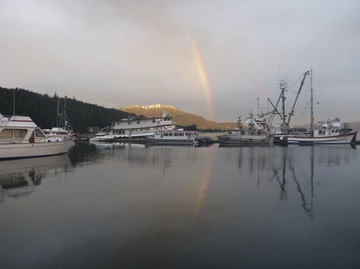 Abendstimmung mit spiegelndem Regenbogenteil in der Auke Bay.