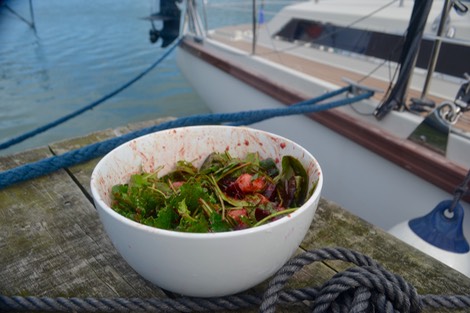 Kartoffel und Rüben kalt werden lassen, dann klein würfelig schneiden und mit dem baby kale und dem grünen Blattsalat (Baby-Spinat, Rucola, etc) mischen. Das Dressing vermischen und ordentlich verrühren.
