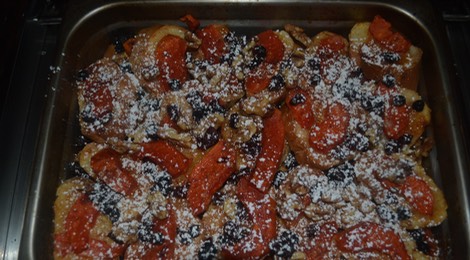 Die getrockneten Baguettscheiben mit Butter und Marillenmarmelade bestreichen. Eine gefettete Form mit einer Lage dieser Baguettes auslegen. Je eine dünne Scheibe Apfel und eine Scheibe Papaya drauflegen, Kran- und Schwarzbeeren drüberstreuen, Zimt nicht vergessen! Dann die Milch mit den Eiern verquirlen und die Hälfte über diese Lage Frucht-Baguette schütten. Dann nochmals eine Lage Baguette mit Butter und Marmelade, Äpfel, Papaya, Trockenbeeren, Zimt und Nüsse drüber und die restliche Milch-Eiermischung vorsichtig mit einem Schöpfer drübergießen. Alle Baguettscheiben sollten mit der Milch-Eiermasse zumindest einmal übergossen worden sein.