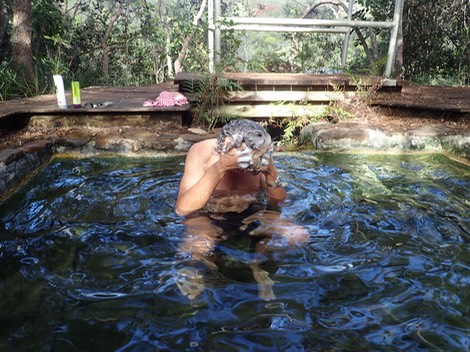 Ca. 30 Grad hat das Süsswasserbecken und der Strom des ablaufenden Wassers zeigt, dass hier sehr viel Wasseraustausch stattfindet. Wir können nicht wiederstehen. Wir rubbeln und schrubben uns so richtig, waschen uns die Haare und genießen dieses paradiesische Fleckchen bis unsere Haut ganz verschrumpelt und aufgeweicht ist.
