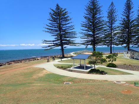 Wir fahren mit den Rädern entlang des Queens Beach bis zum Radcliffe Point. Es ist Samstag und an der Radcliffe Parade haben sich tausende Menschen versammelt. Es gibt hier kein Restaurant und kein Kaffeehaus, aber dutzende BBQ Gelegenheiten und die Familien sind Selbstversorger. Überall gibt es Bänke, Tische und Toilettenanlagen.